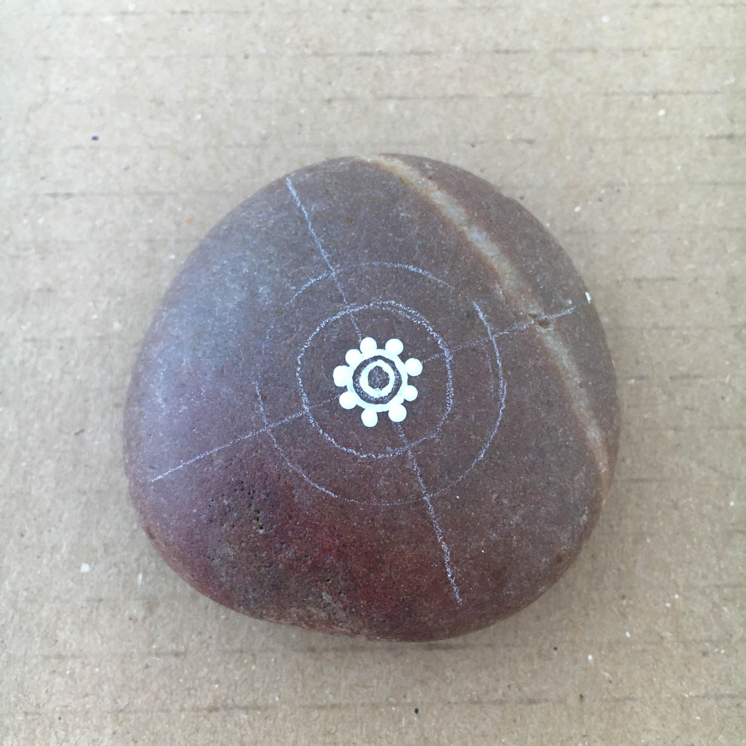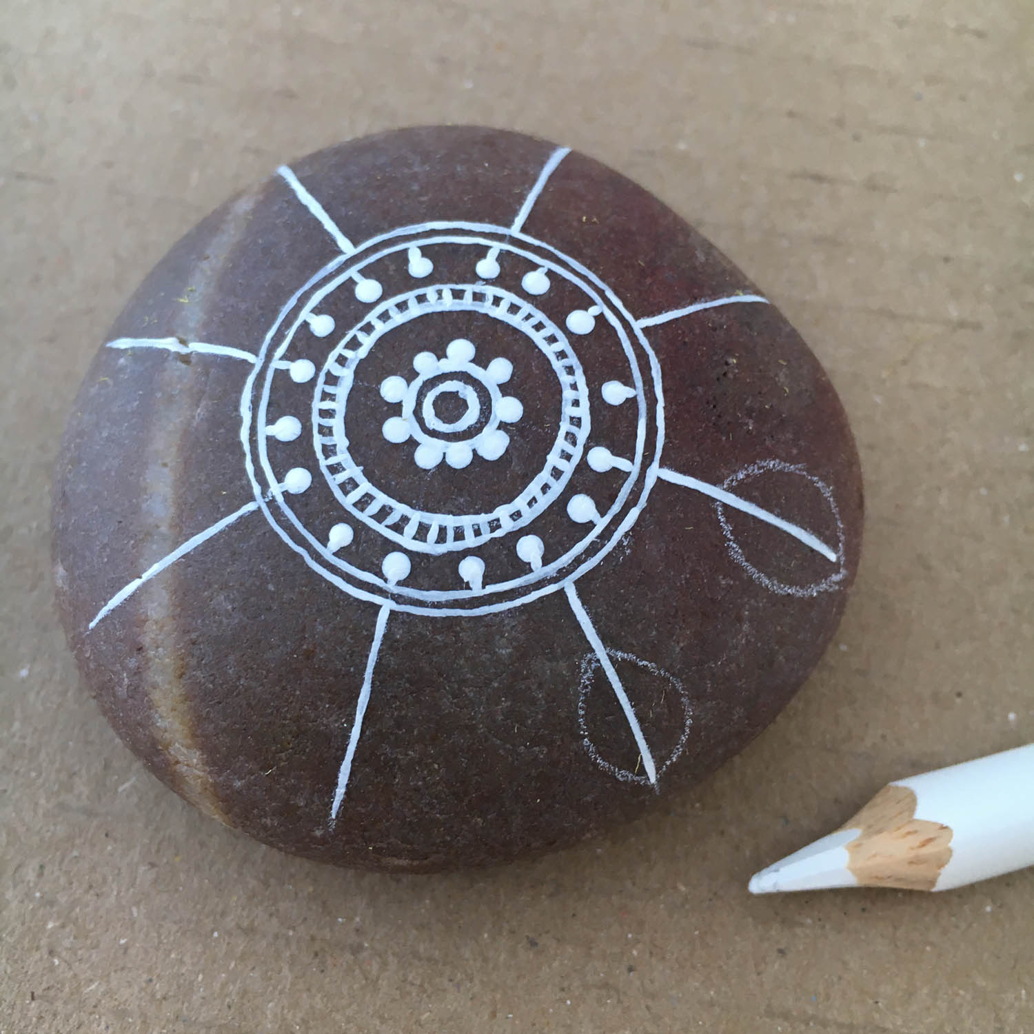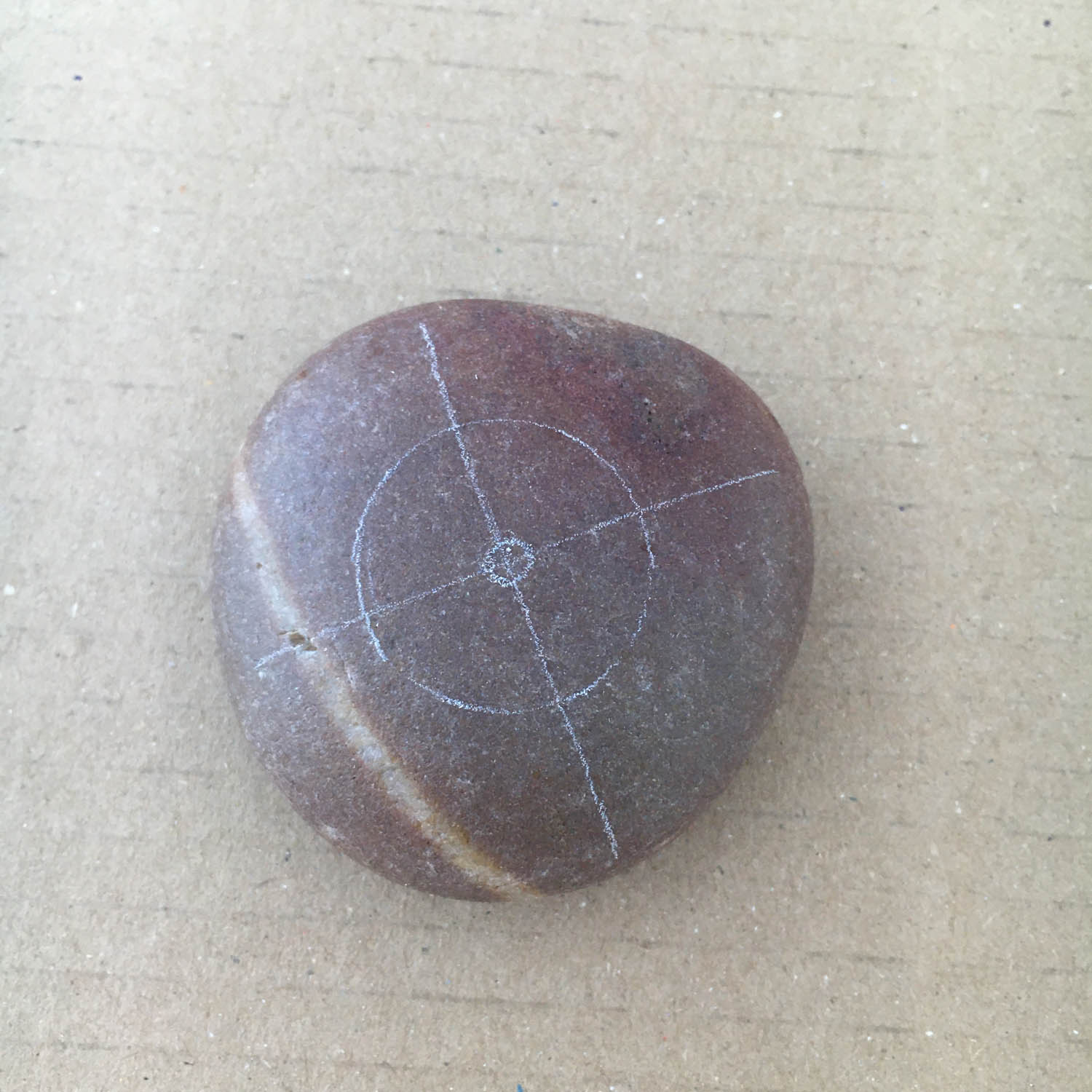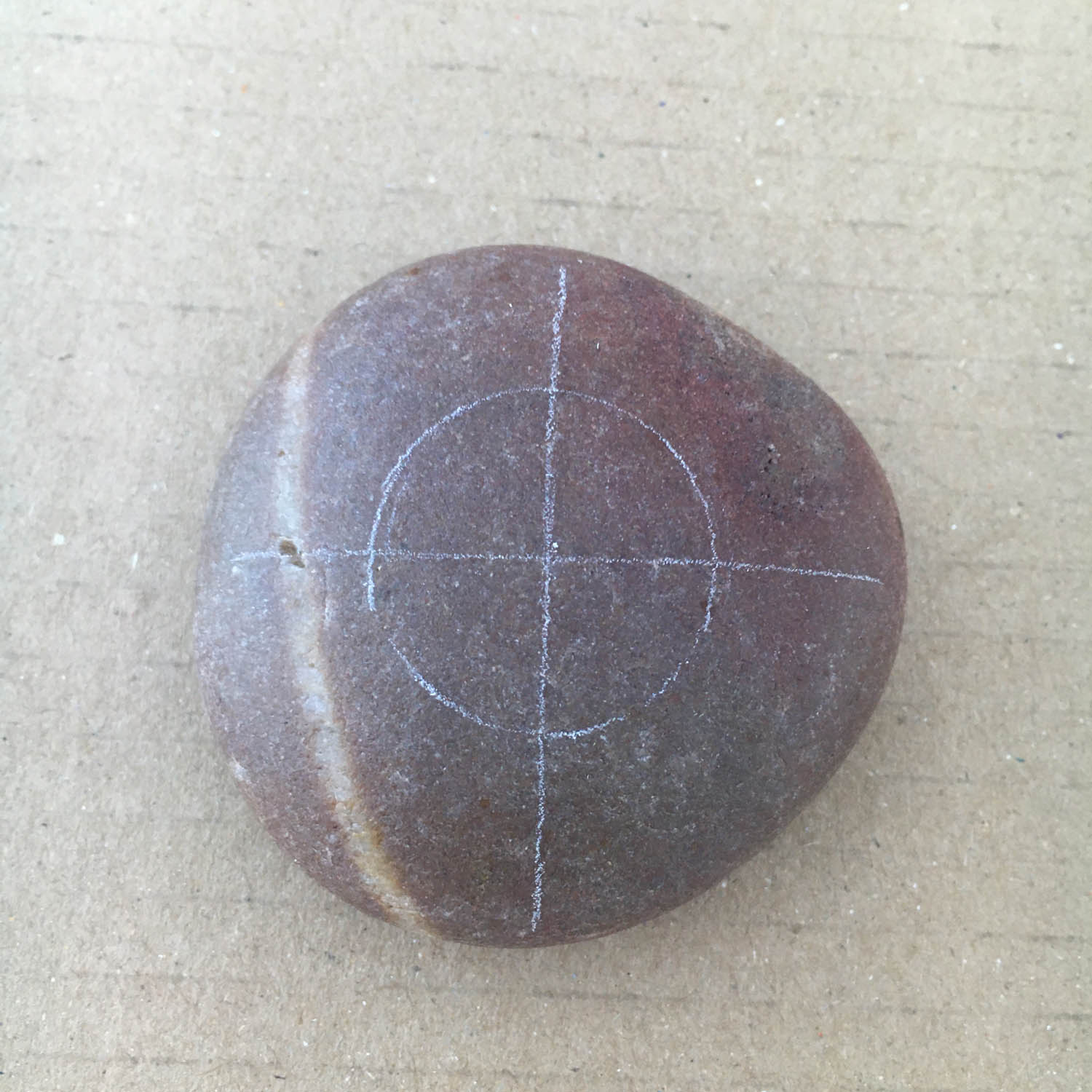 This white circle can serve as a guide to find the centre of the pebble by drawing a cross through the centre of the circle. Again, it doesn't have to be 100%. If you are way out with your lines, you can use an erasor on the white pencil lines.