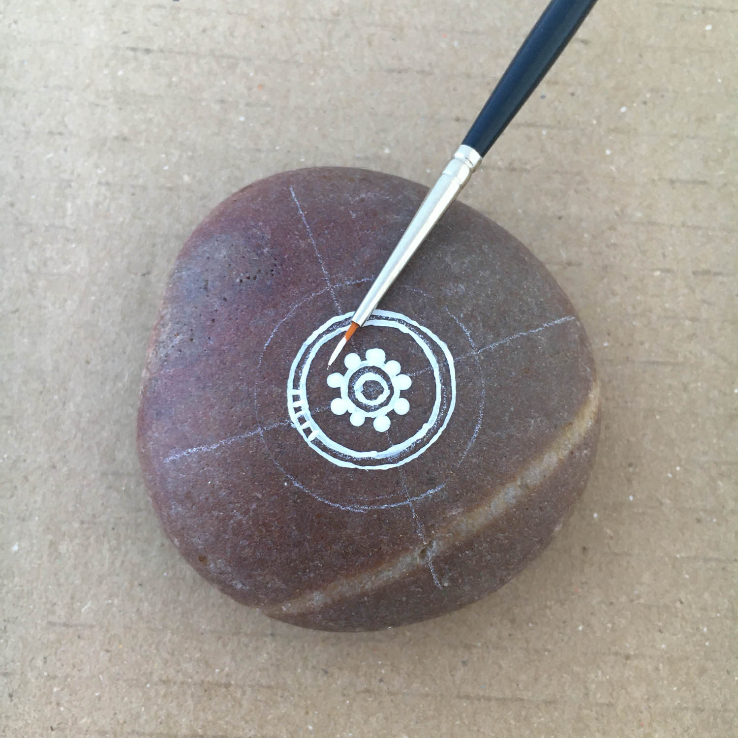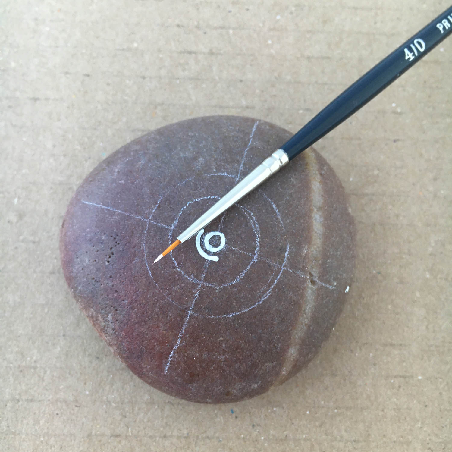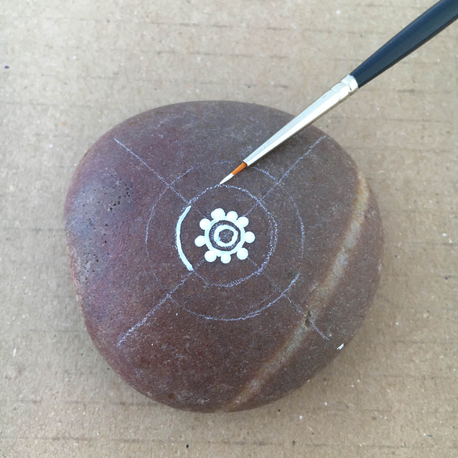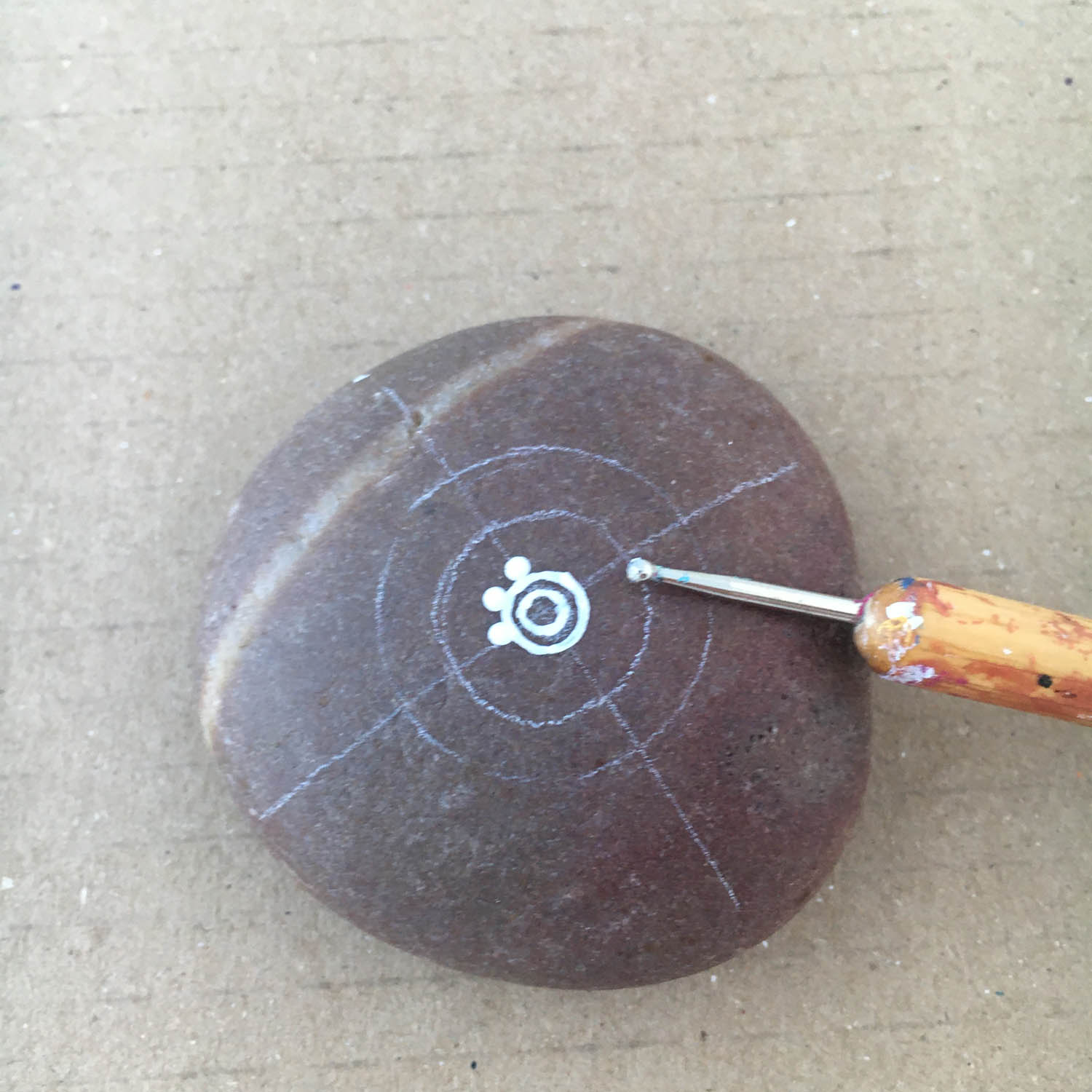 Draw a small circle right in the centre of the pebble where the lines cross.