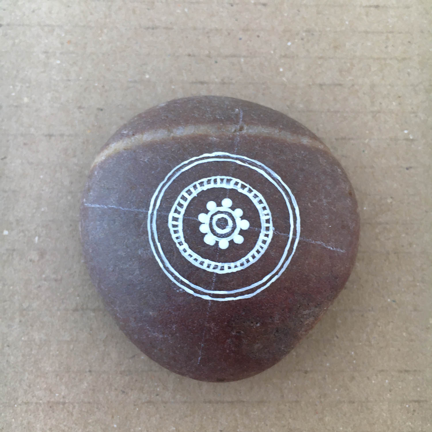 Paint a second thin, delicate circle around the centre one. turning the pebble as you go along so you can make best use of the 45º angle.