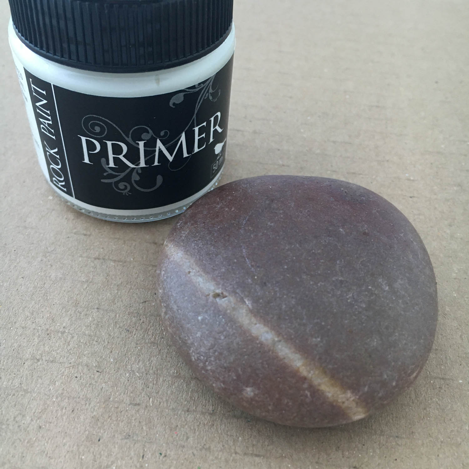 Once dry, apply a thin layer of primer over the top side of the pebble. Primer will give you a good surface for fine detail.