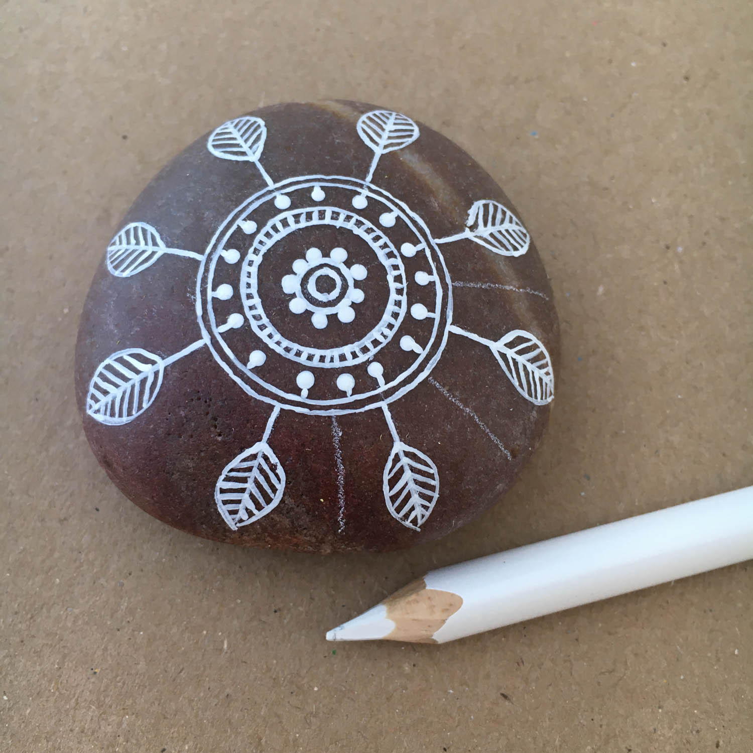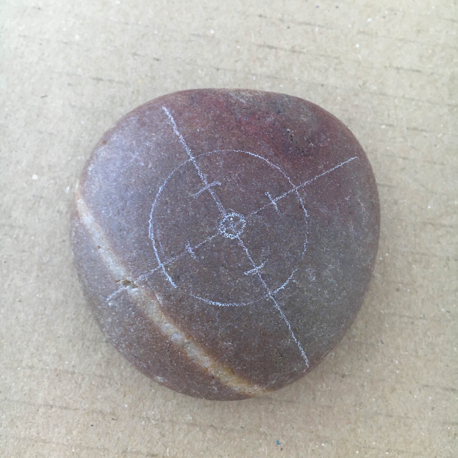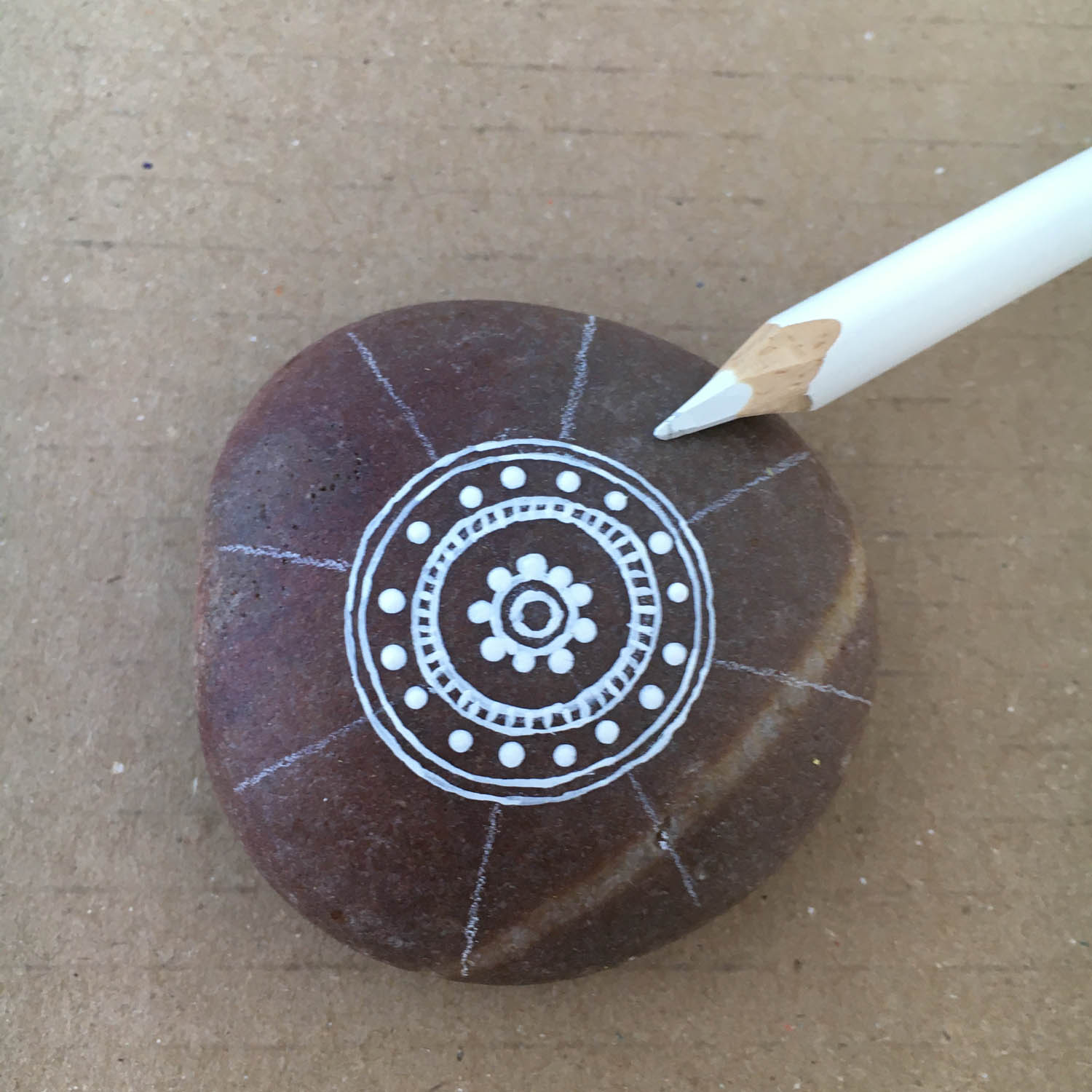 Using your white pencil, extend your four lines to the outer edge of the pebble but not over the edge. Your previous lines may have become faint from rubbing them while working.
