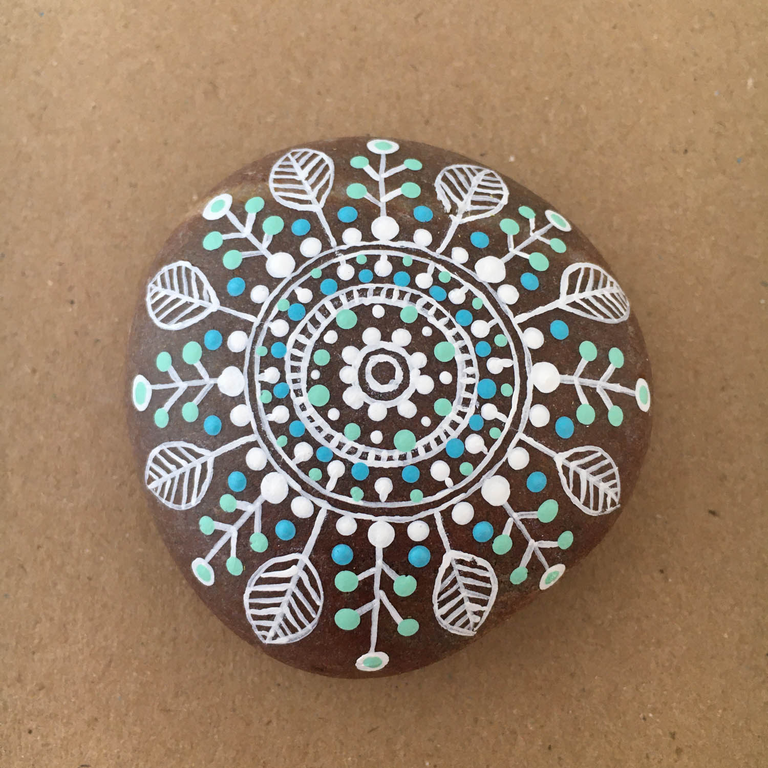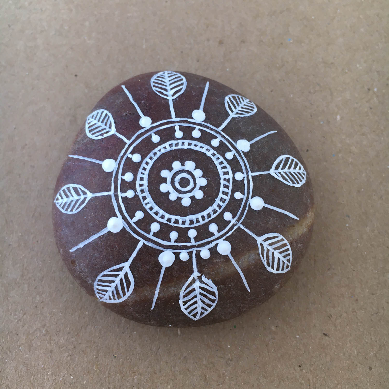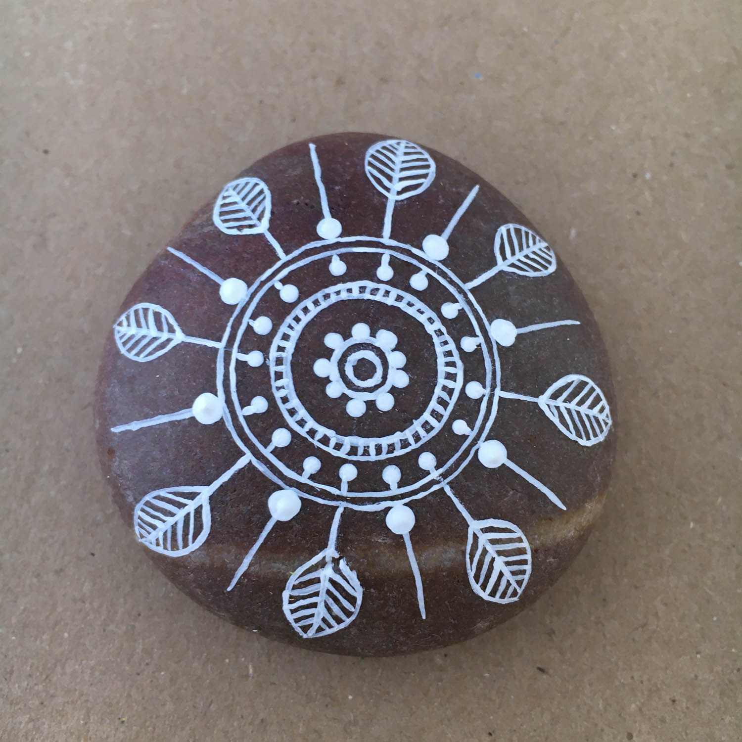 Complete mandala, top view. When you paint a mandala, you can use any combination of lines, double lines, leaves and dots and it will look great.