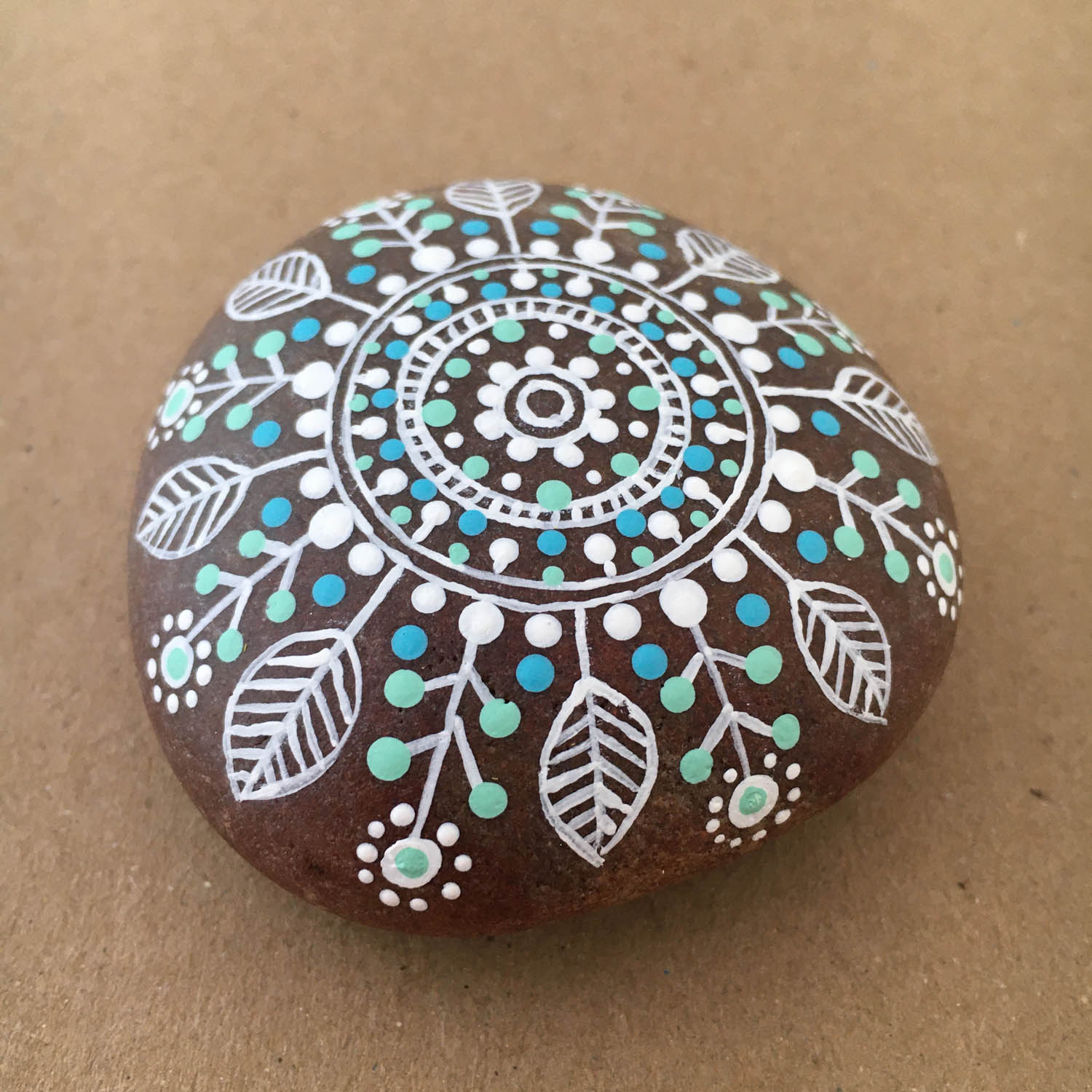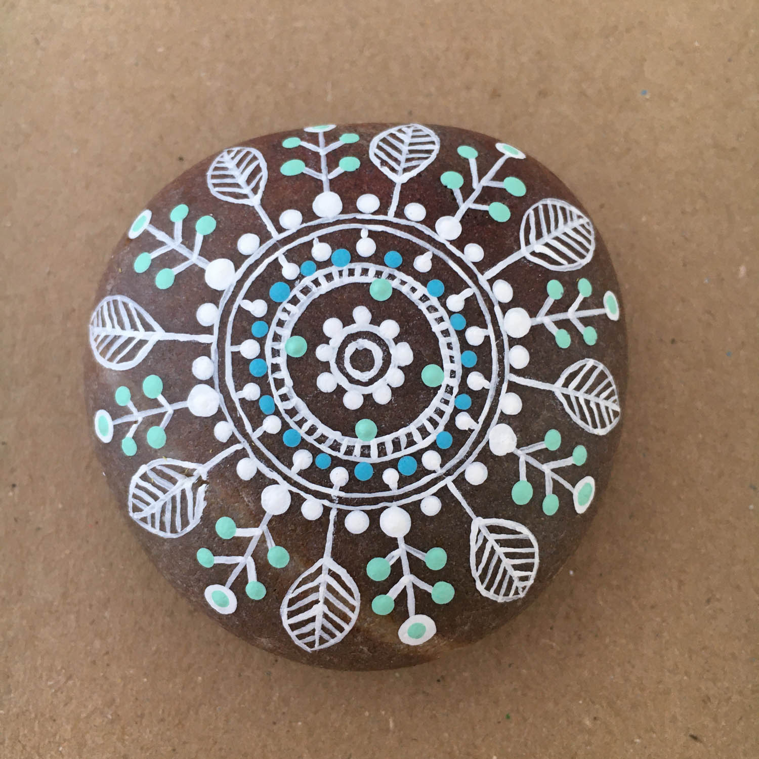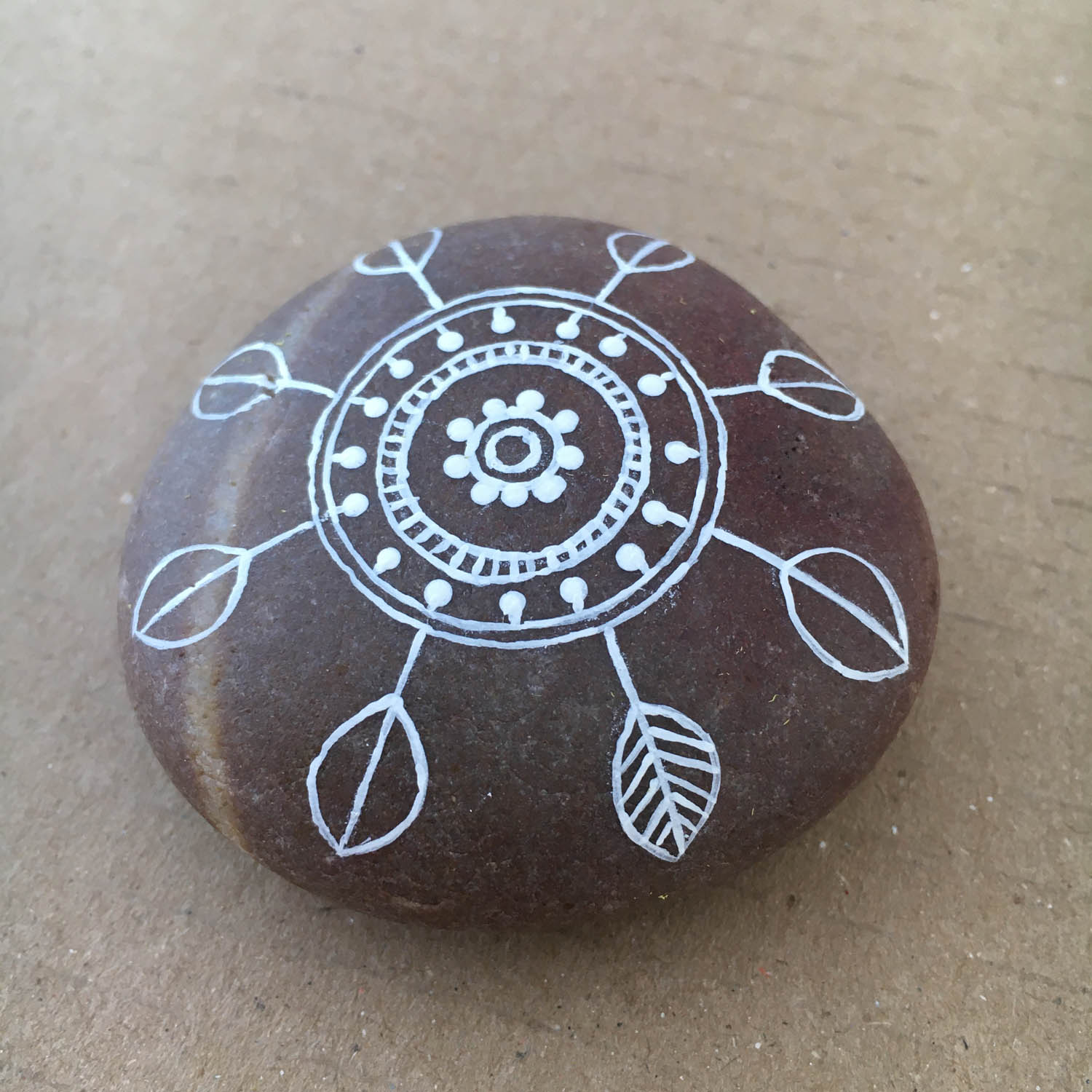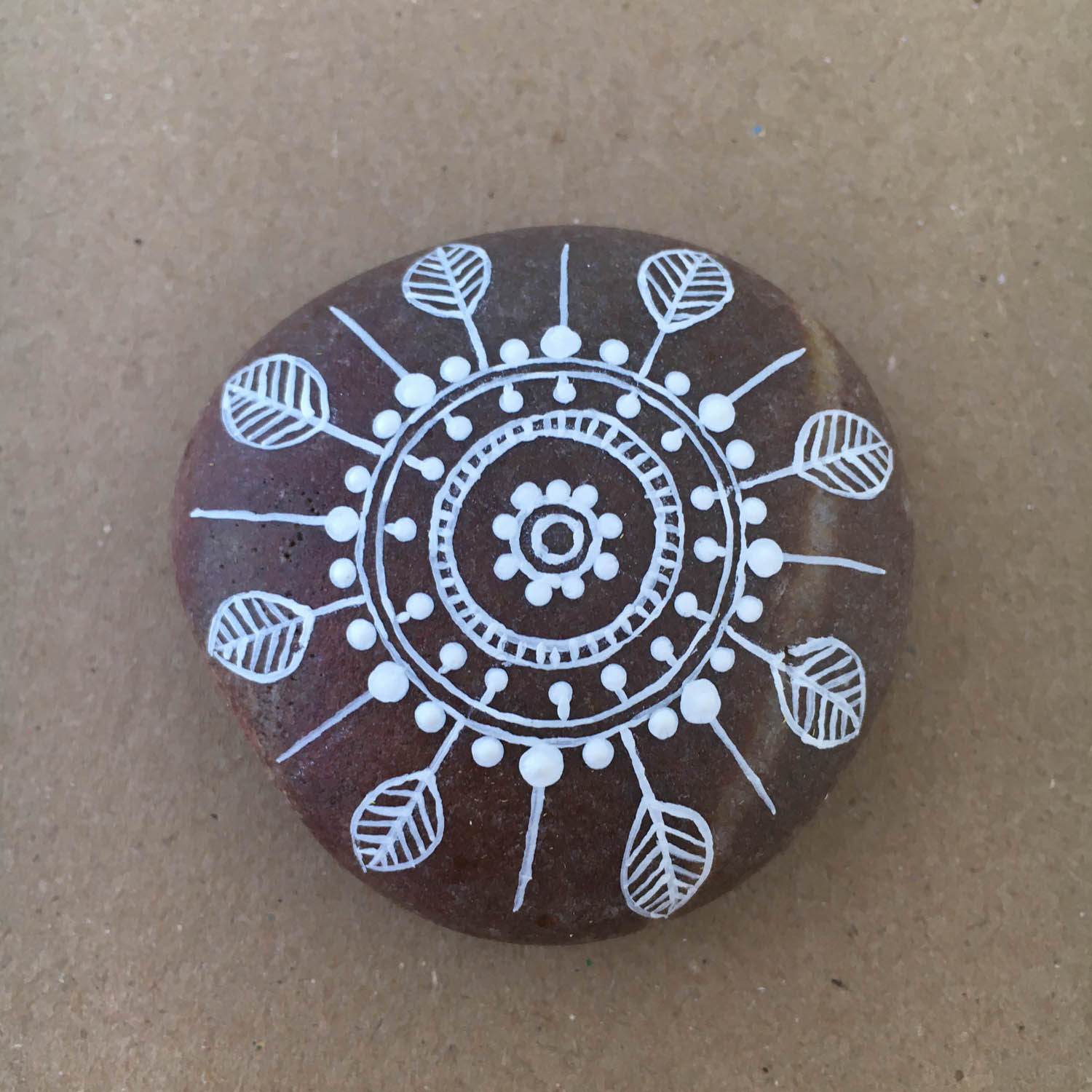 Complete mandala, top view. When you paint a mandala, you can use any combination of lines, double lines, leaves and dots and it will look great.
