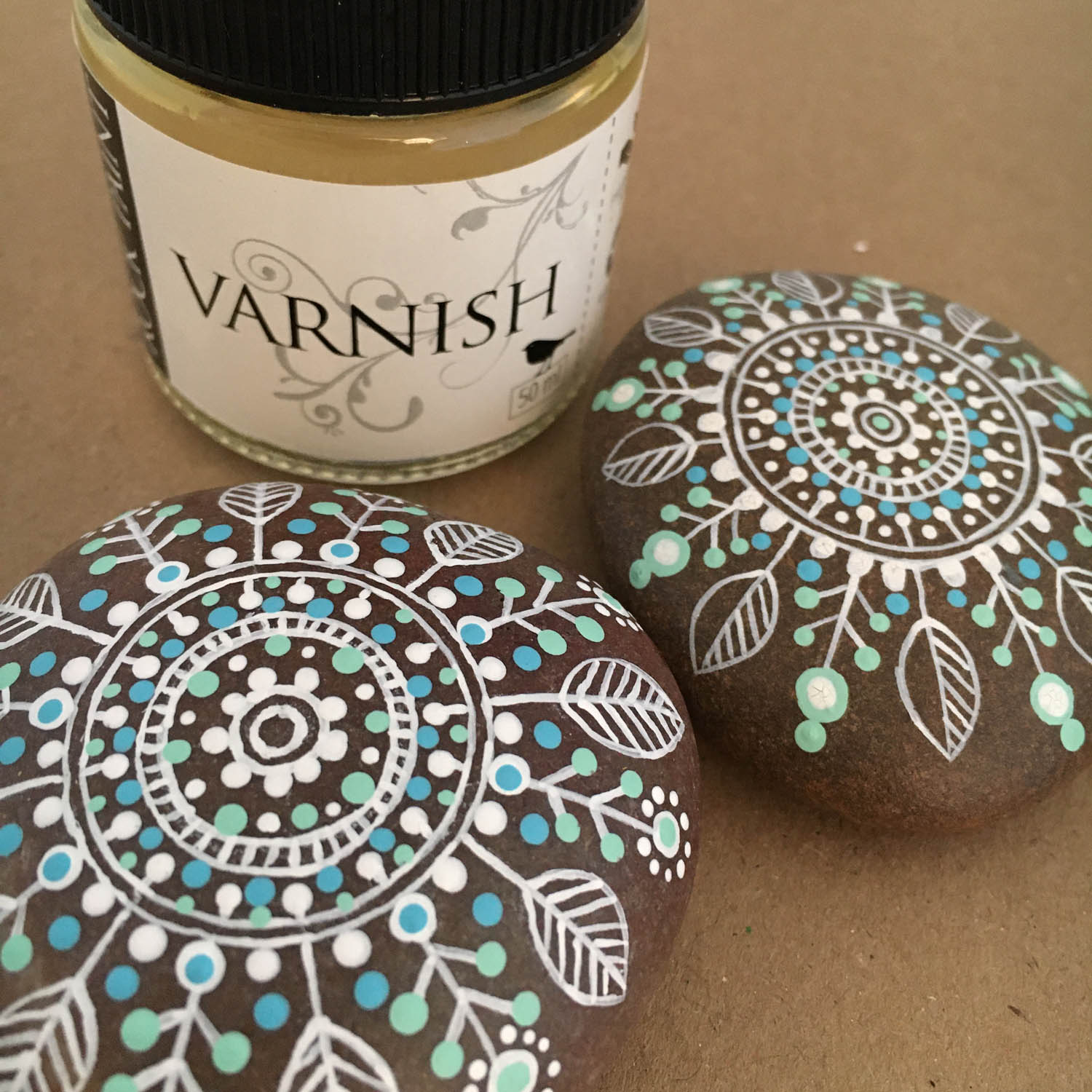 Once dry, give the pebble one layer of varnish, allow to dry and varnish the reverse. The varnish will soak into the pebble and bring out the natural colouring. It will dry quite quickly.