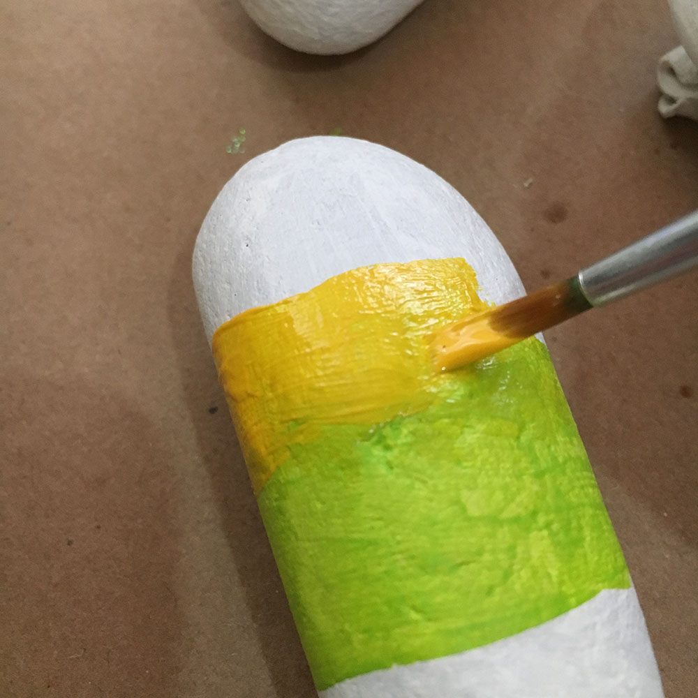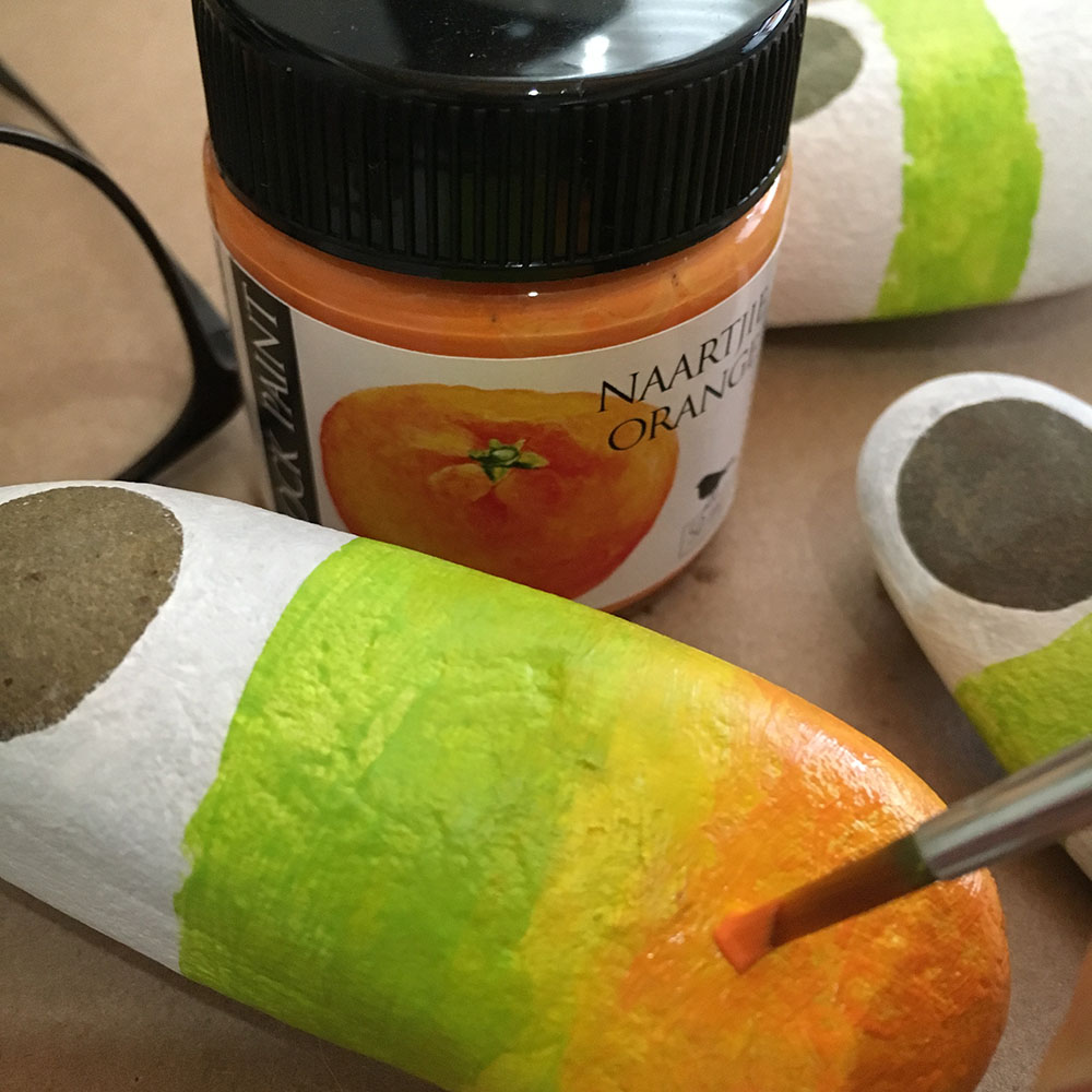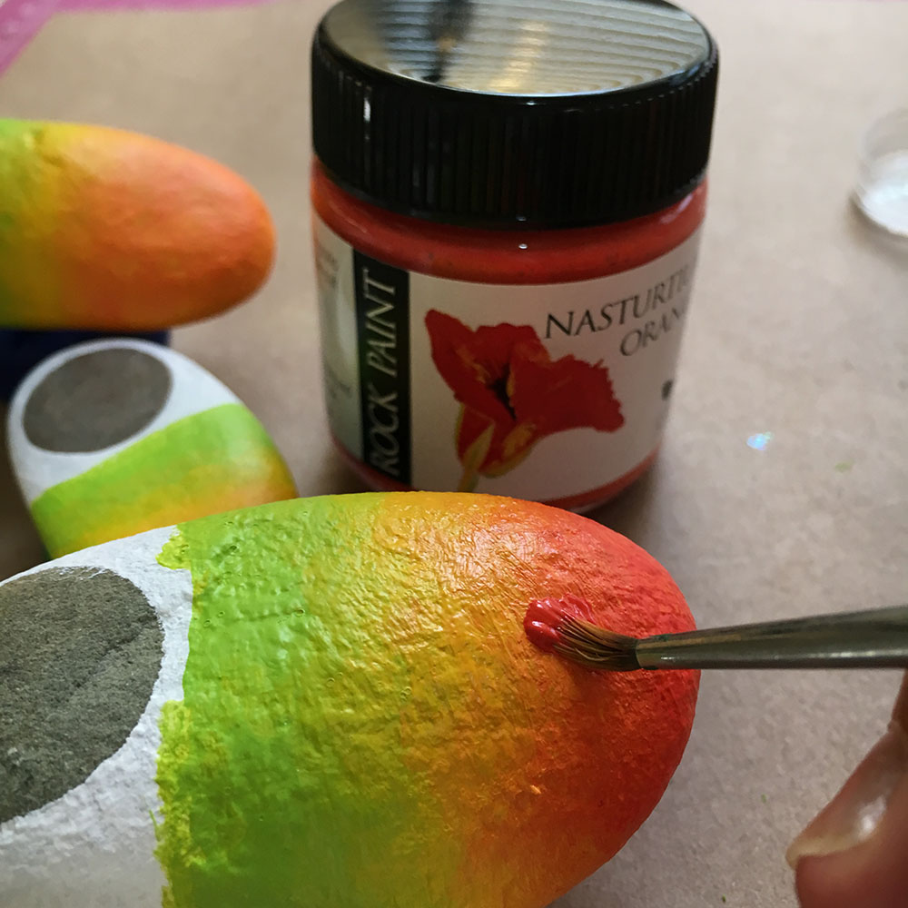 Allow the paint to dry. Lastly, for the bottom area of the rock, paint Nasturtium Orange over the end, fading it off half way through the lighter orange area, use your brush to create the fade