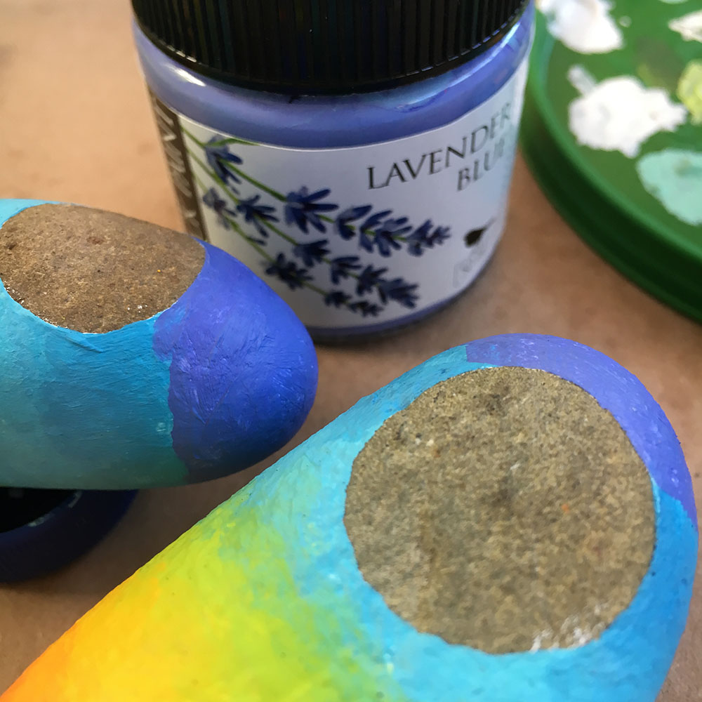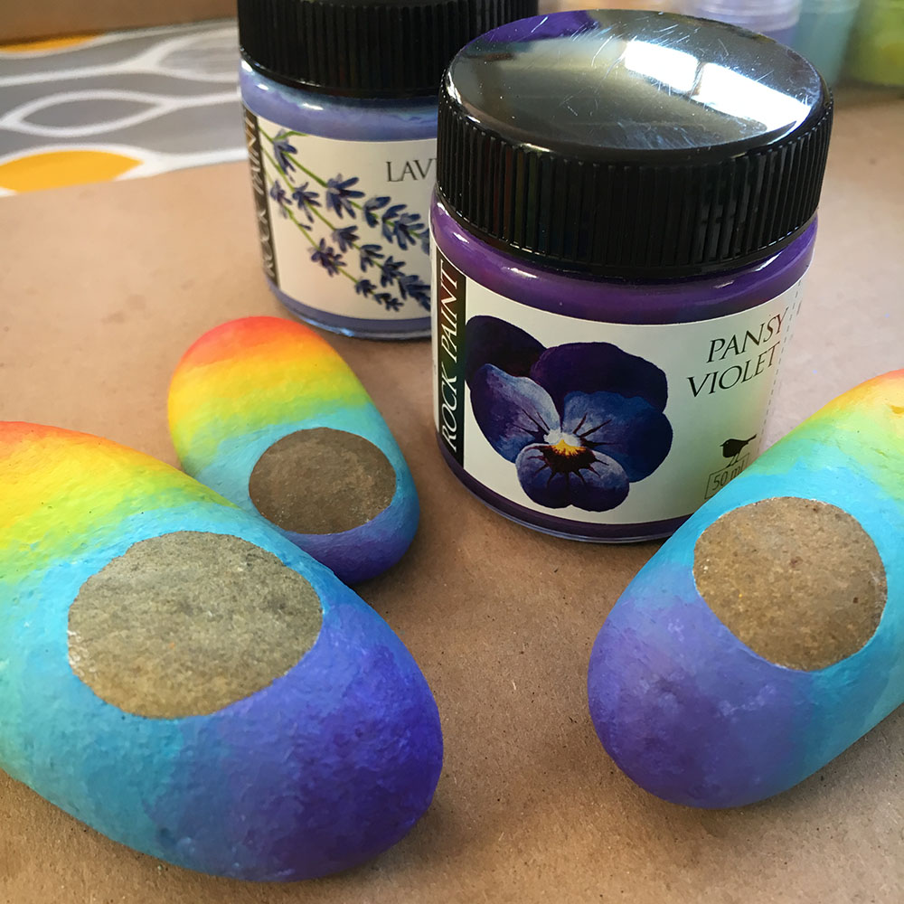 Allow all the paint to dry then use Pansy Violet on the very end of the head area of the rock, paint it to fade off half way through the Lavender Blue colour.