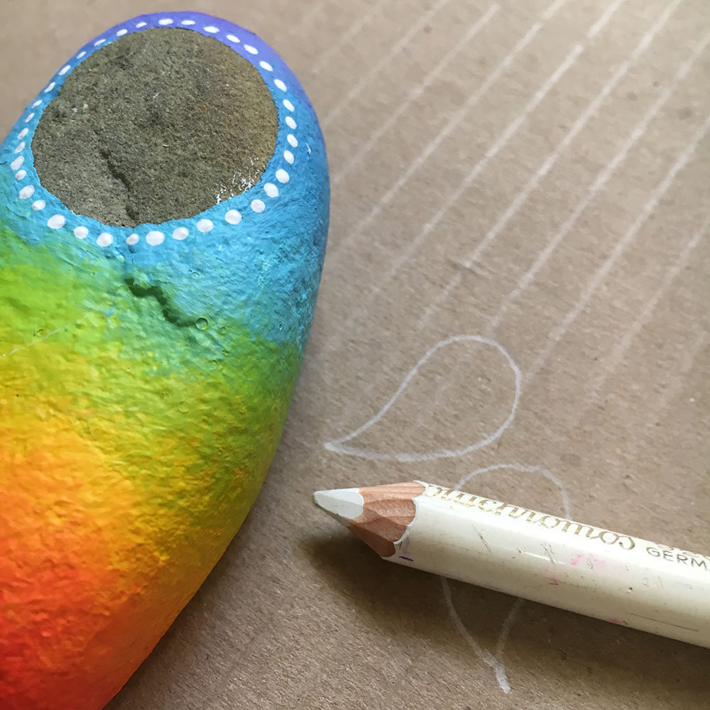 When dots are dry, use a white pencil to mark a paisley shape on the rainbow baby. First practive on a piece of paper, it's a teardrop shape.