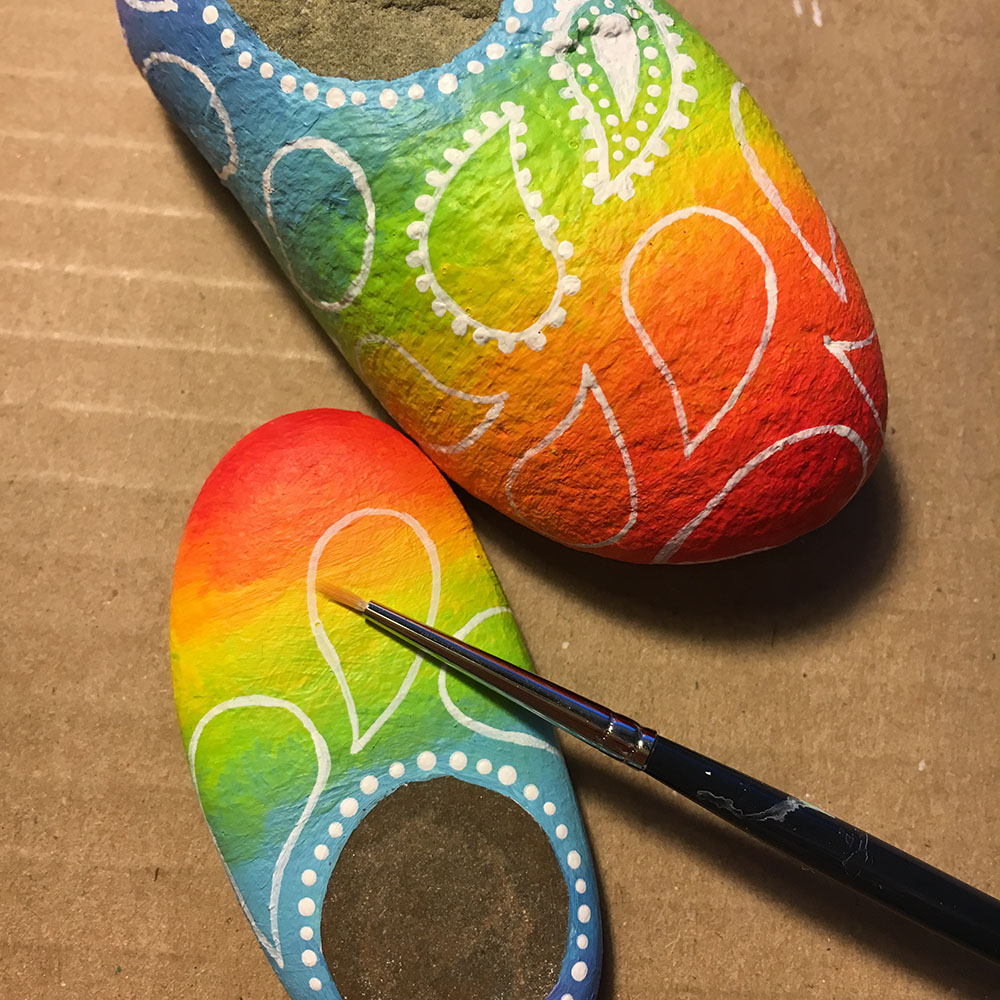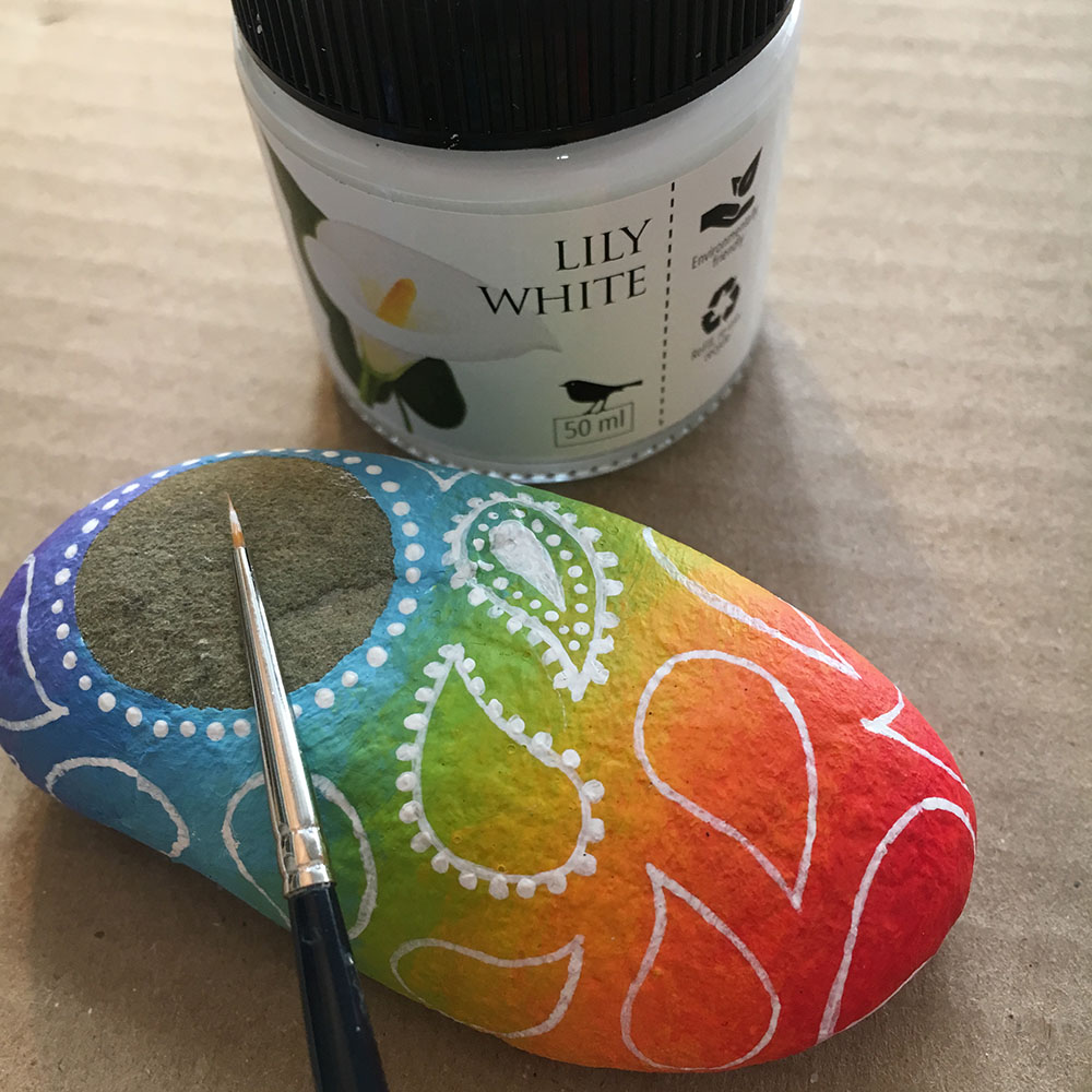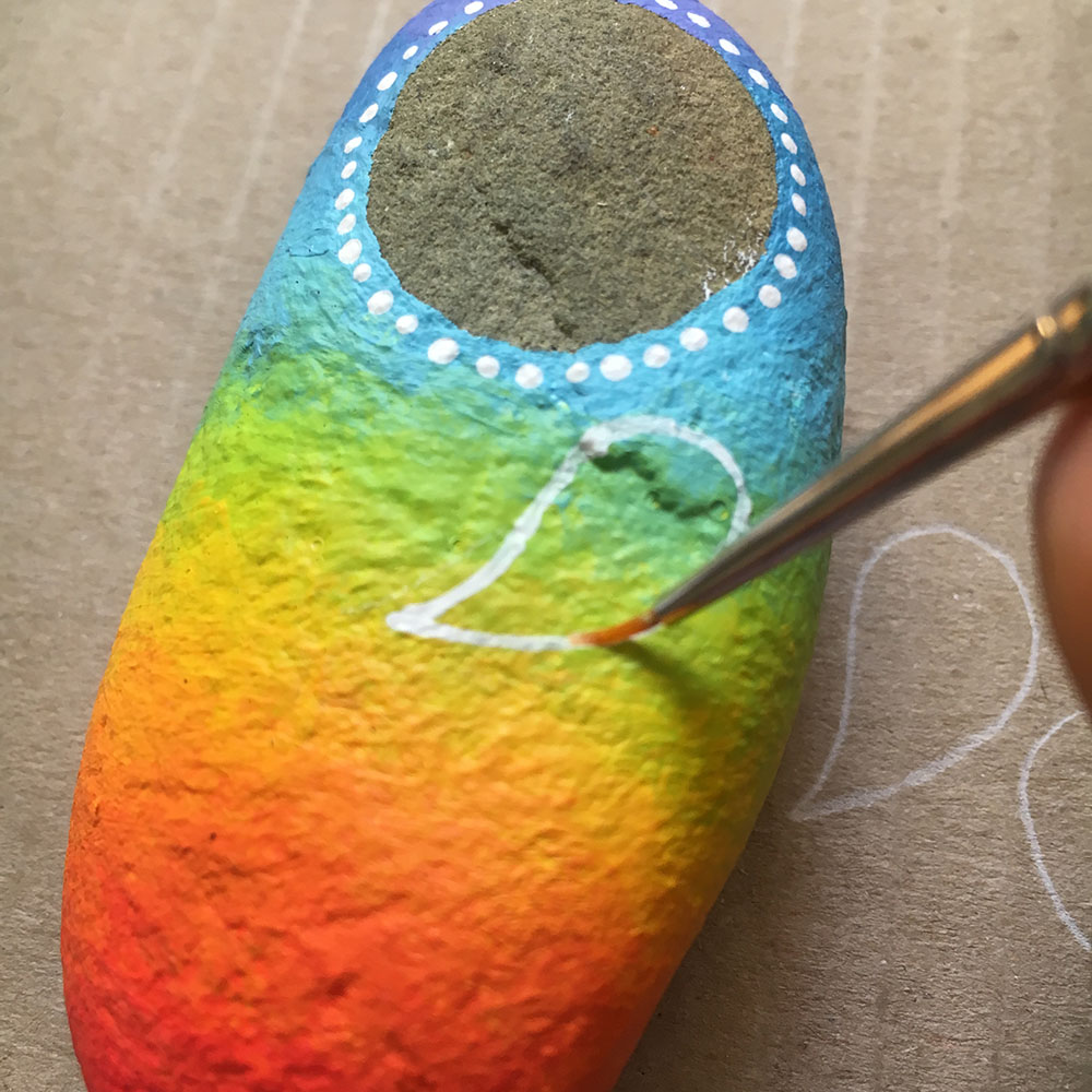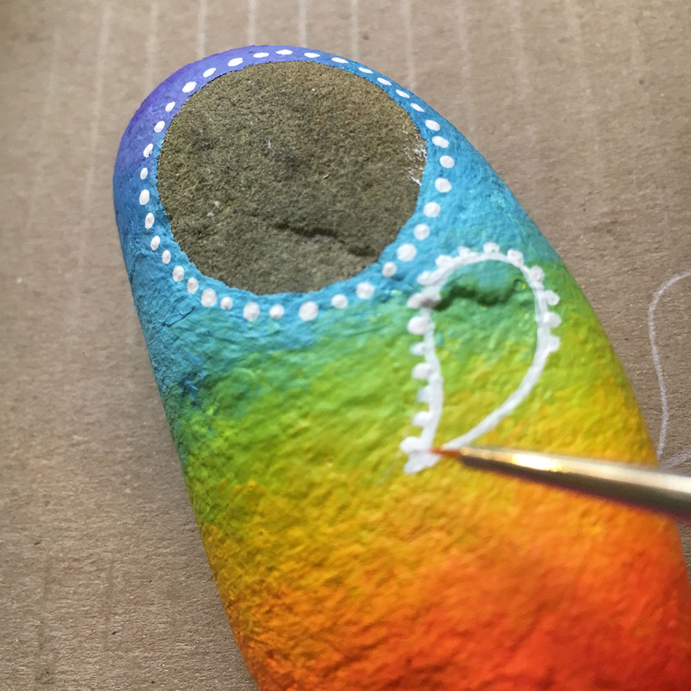 The little rainbow baby is complete. If you would like a bit more fine detail, add a teardrop shape inside the white teardrop shape to match the colour behind the paisley shape. You can do this all over the rock, matching the colour behind as you go along. Remember to varnish your rock once all the paint is completely dry.