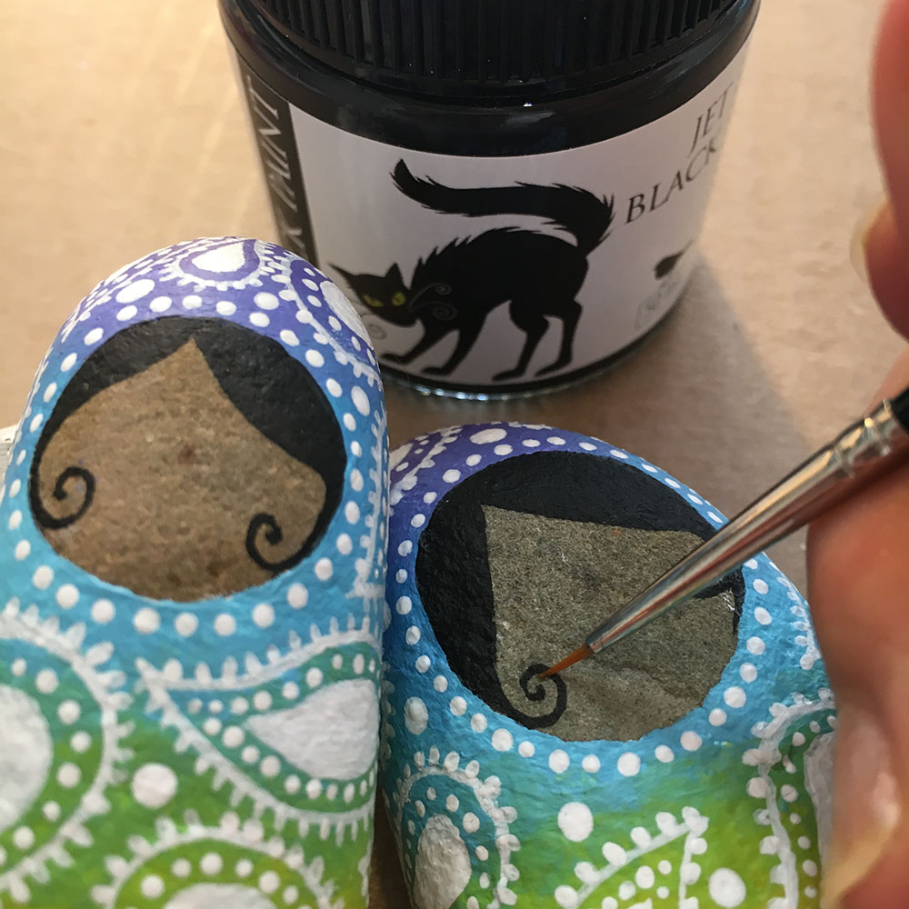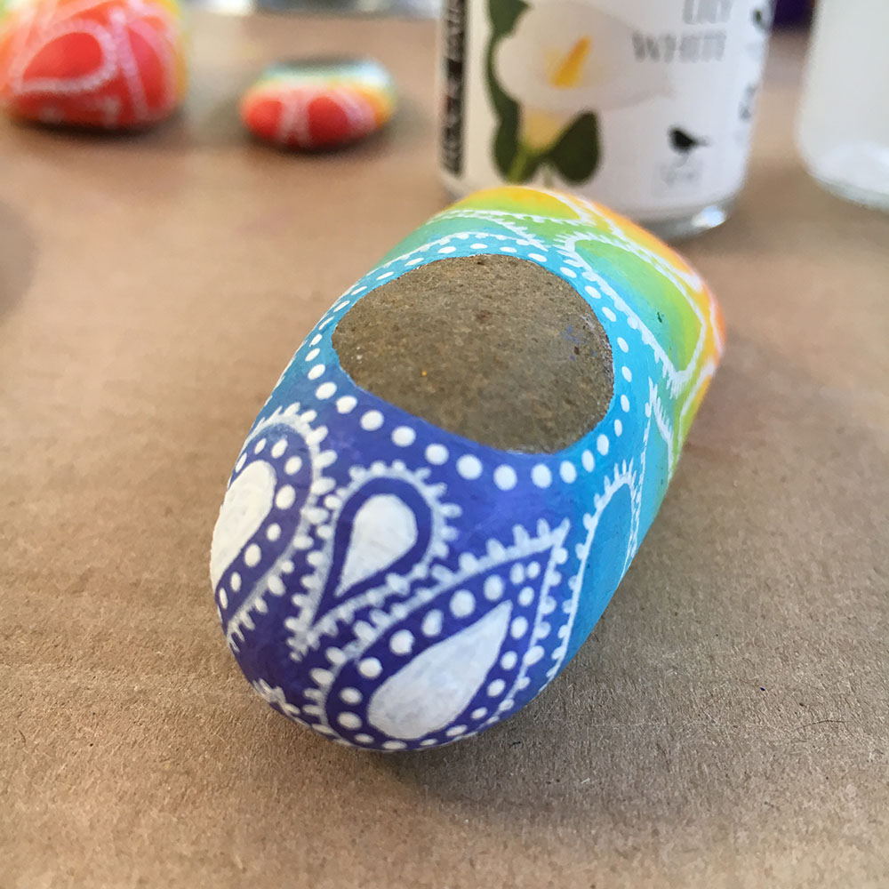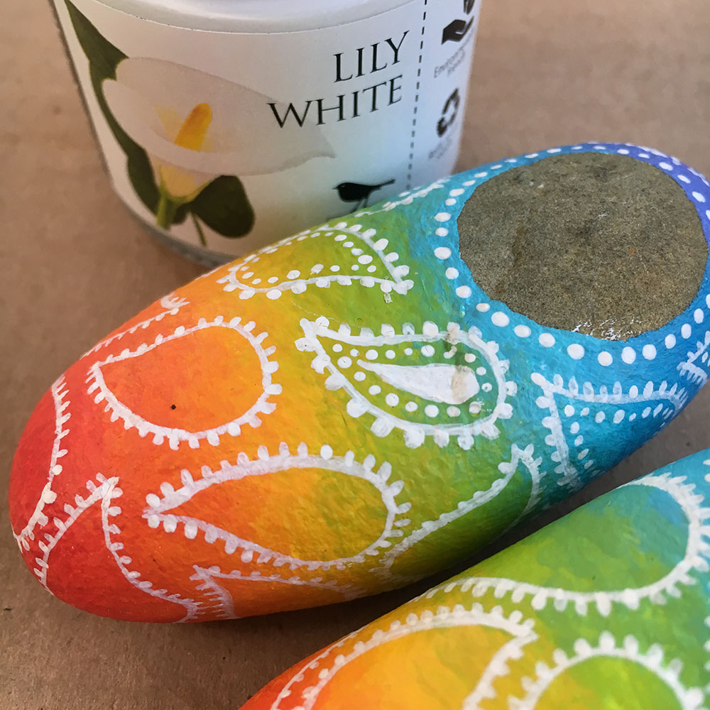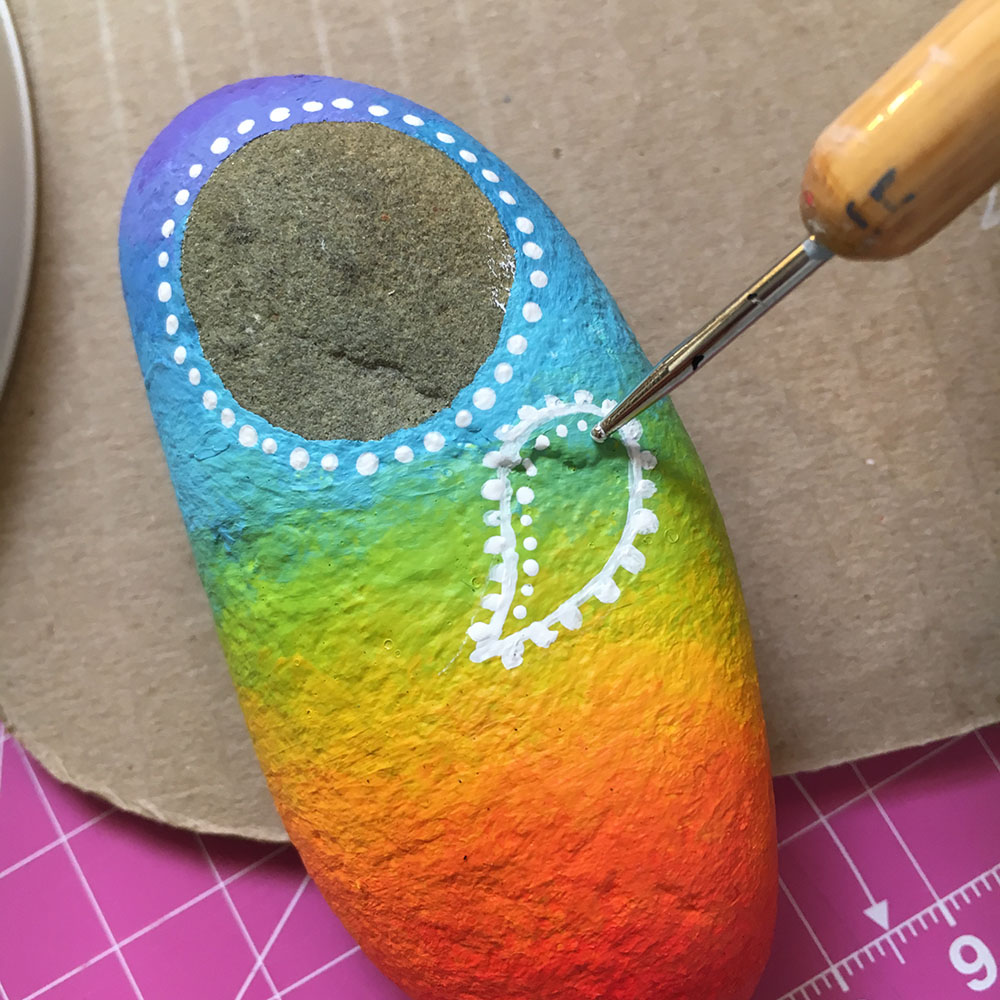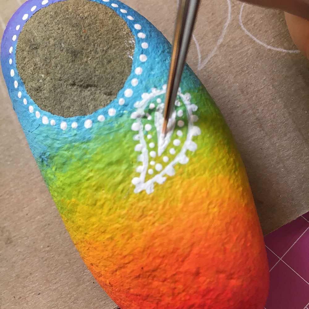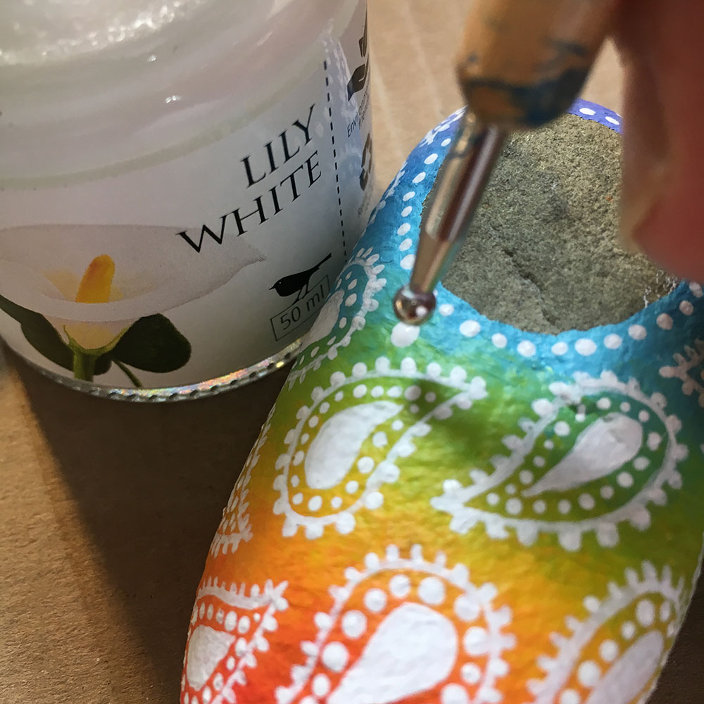 Step-by-step photos and instructions on how to paint a delicate, fine detailed Paisley design onto a Blended Rainbow coloured painted rock. (Hover over the pictures for instructions).