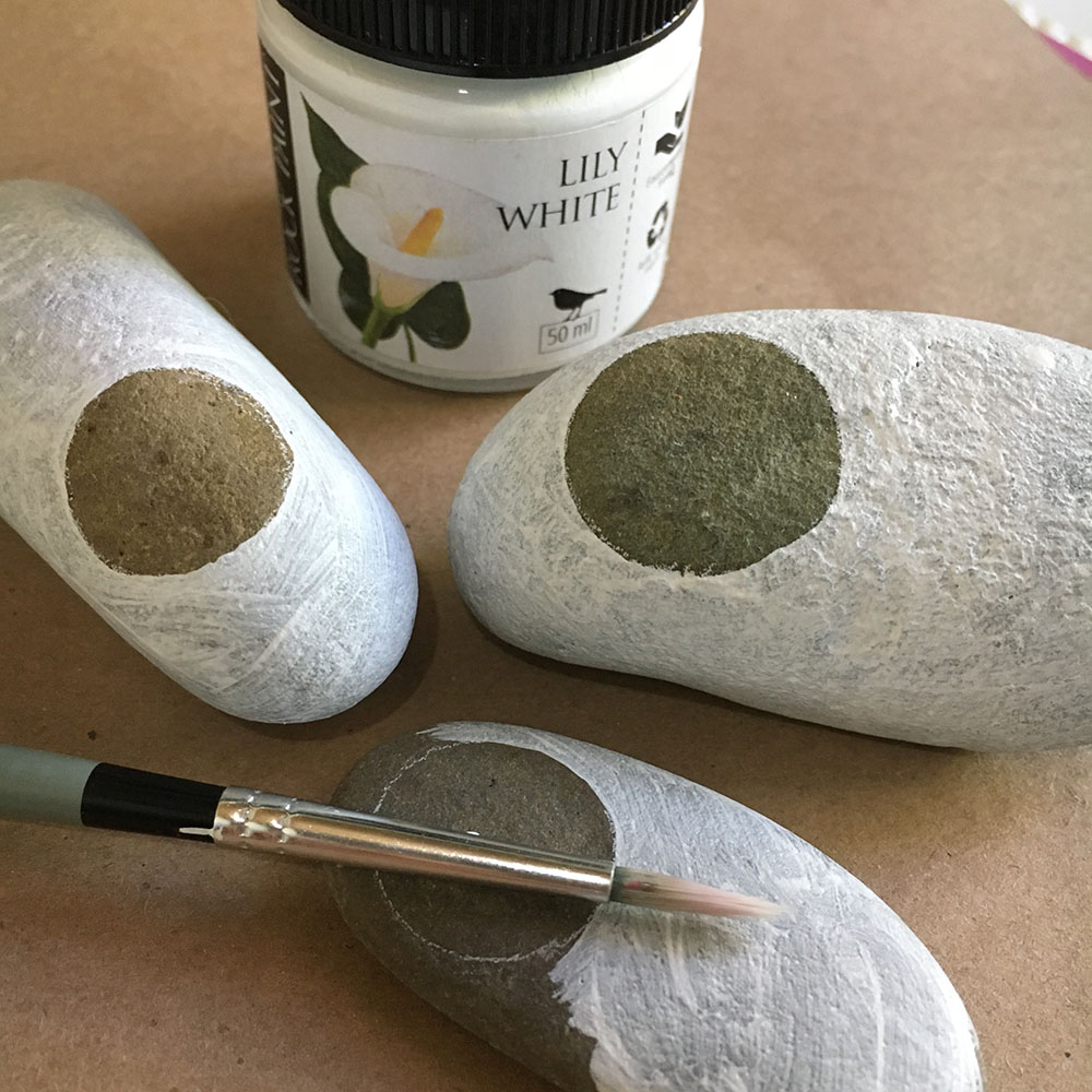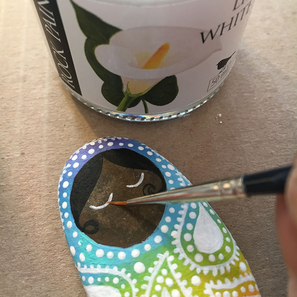 Once all the paint is dry front and back of the pebble, you can start with white fine detail work. Using a dotting tool with a small metal ball, dip into white paint and carefully dot Lily White paint all around the face area.