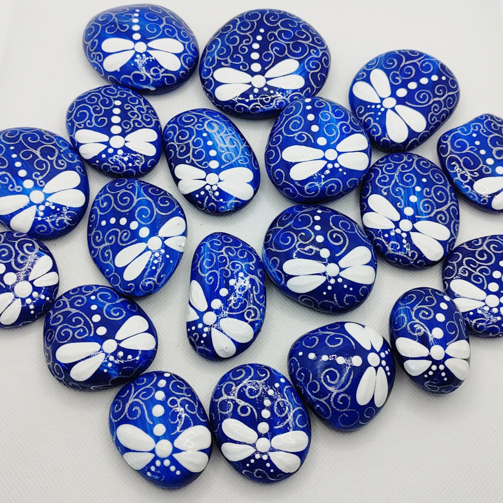 These are Angelique’s signature daisies on the deep blue background. To commission painted rocks, please
